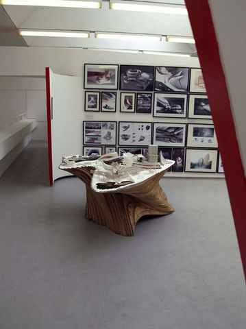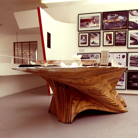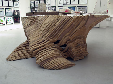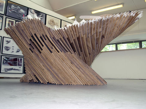 The Nurbster IX was designed for the Westminster student show. On a 1:1 scale, the design of the NURBSTERs is developed through intense CAD 2D and 3D modelling techniques. The manufacturing is performed through CAD/CAM technologies, especially laser cutting, water jetting and thermoforming. All components are cut by CAD-operated machines out of standard-sized MDF, plywood, or metal boards. A series of layered sections create a complex volume of NURBS (non-uniform rational B-splines). They build up a complex object, fitting programmatic, structural, ergonomic requisites expressed through curvilinear and arabesque geometries. The NURBSTERs’ ornamental character expresses deliberate eccentricities within the precision and material efficiency of the CAD-operated process.